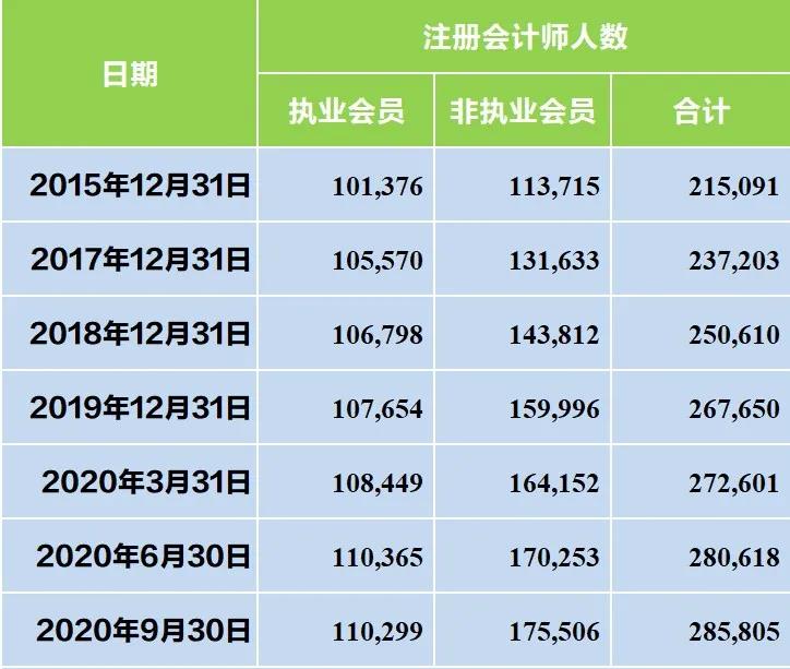 可以看到,5年后实现32万人数目标看似很高,但早在20年第三季度结束的时候,执业和非执业人数就已经有28.5万人了,也就是说未来五年的注册会计师净增人数也不过是3万左右!