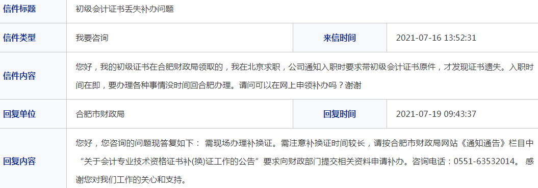 您好:您好,我的初级证书在合肥财政局领取的,我在北京求职,公司通知入职时要求带初级会计证书原件,才发现证书遗失。入职时间在即,要办理各种事情没时间回合肥办理。请问可以在网上申领补办吗?谢谢