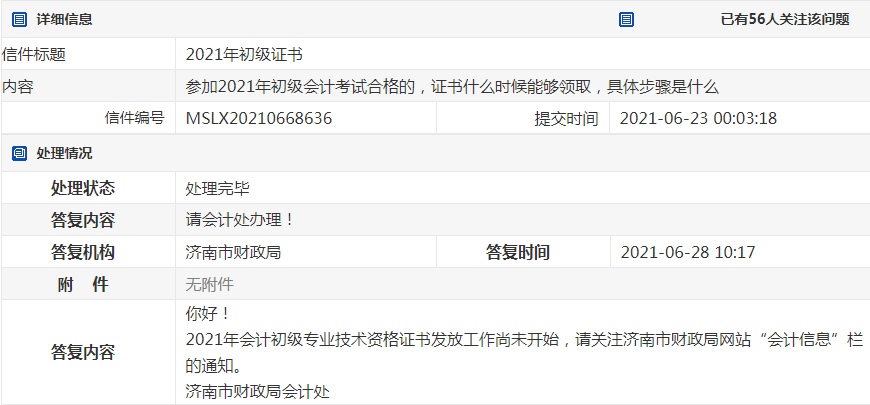 答复:2021年会计初级专业技术资格证书发放工作尚未开始,请关注济南市财政局网站“会计信息”栏的通知。