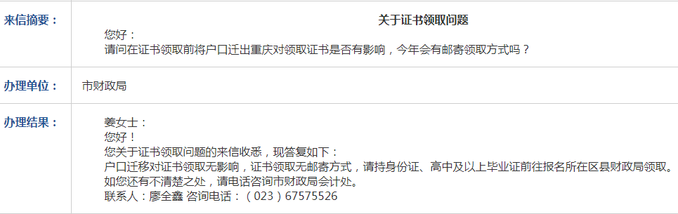 答复:户口迁移对证书领取无影响,证书领取无邮寄方式,请持身份证、高中及以上毕业证前往报名所在区县财政局领取。