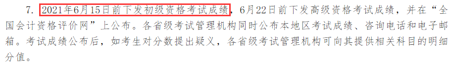 2021年6月15日前下发初级资格考试成绩,并在“全国会计资格评价网”上公布。