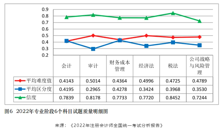 根据中注协发布的《2022年注册会计师全国统一考试分析报告》,我们可以了解到CPA各科的难度(系数越接近于1,试题难度越低):会计>财管>税法>战略>经济法>审计