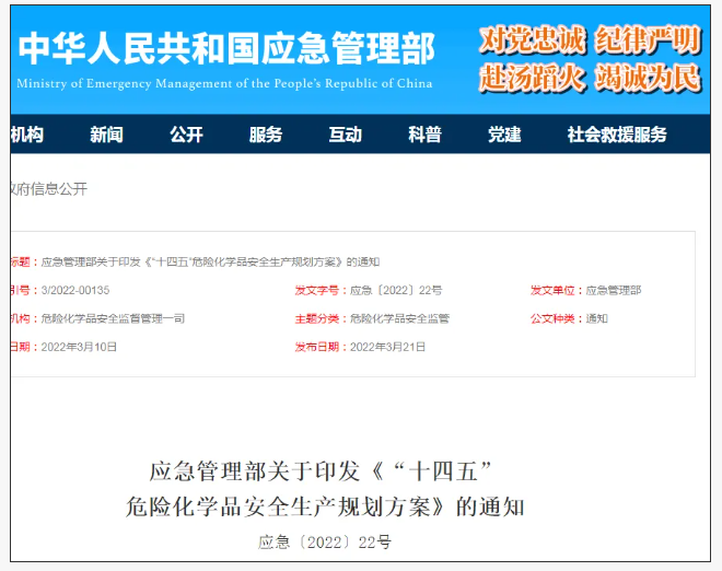 应急管理发布关于印发《“十四五”危险化学品安全生产规划方案》的通知。